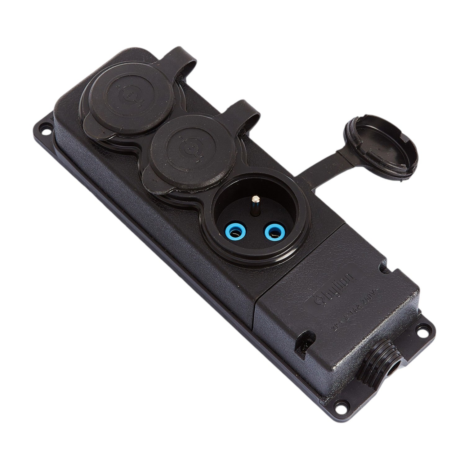 3x socket, French type E, triple "rubber" black socket with cover hermetic IP44 250V, 16A, 2P+Z, 3KMP-E, Bylion
