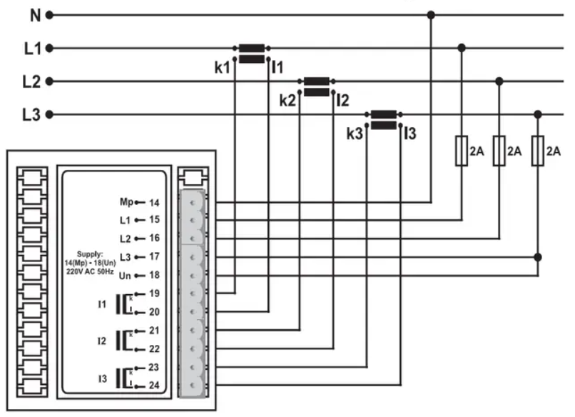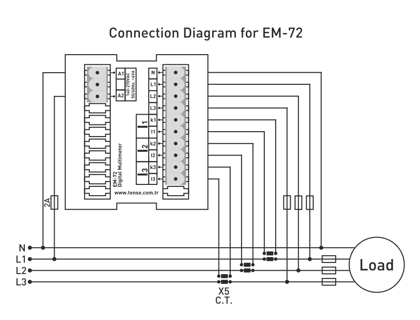 Normalerweise wird dieses Multimeter (EM-06/EM-72) mit Strommesswandlern verwendet - 60/5 75/5 100/5 150/5 200/5 250/5 300/5 400/5 500/5 600/5 800/5 1000/5 1500/5 oder ähnlich. Sie können solche Transformatoren in unserem e-shop kaufen,