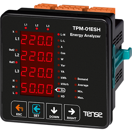 3-Phasen Netzanalysator / Network Analyzer / Network Parameter Meter - Multifunktionales digitales Messgerät, Strom-, Spannungs-, Frequenz- und Gesamtleistungsanzeige, mit zwei Relaisausgängen und digitalem Eingang, RS485 ModBus RTU - TPM-01ESH Hersteller TENSE (Türkei)