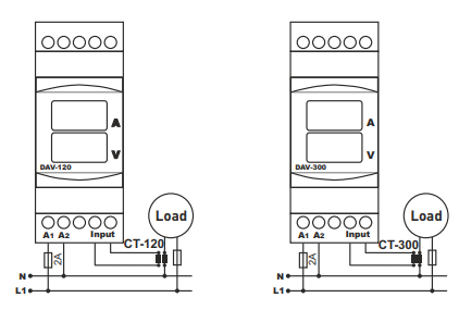 Wechselspannung zwischen Phase und Nullleiter, und des Laststroms (AC), der von einem externen Stromwandler (CT) gemessen wird. Das Gerät wird in elektrischen Schalttafeln, in der Fertigung, in der Verteilung und in Energieüberwachungssystemen eingesetzt.