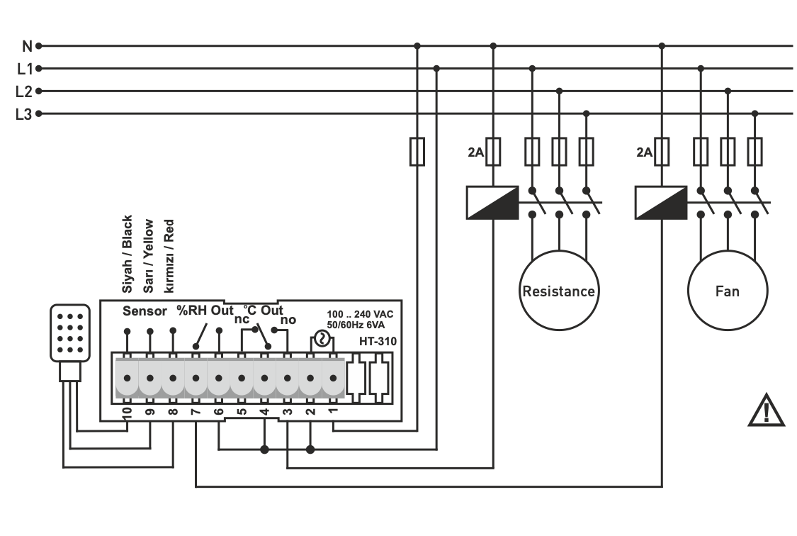 • %RH-Ausgang - Relais (NO), 250VAC, 2A, ohmsche Last