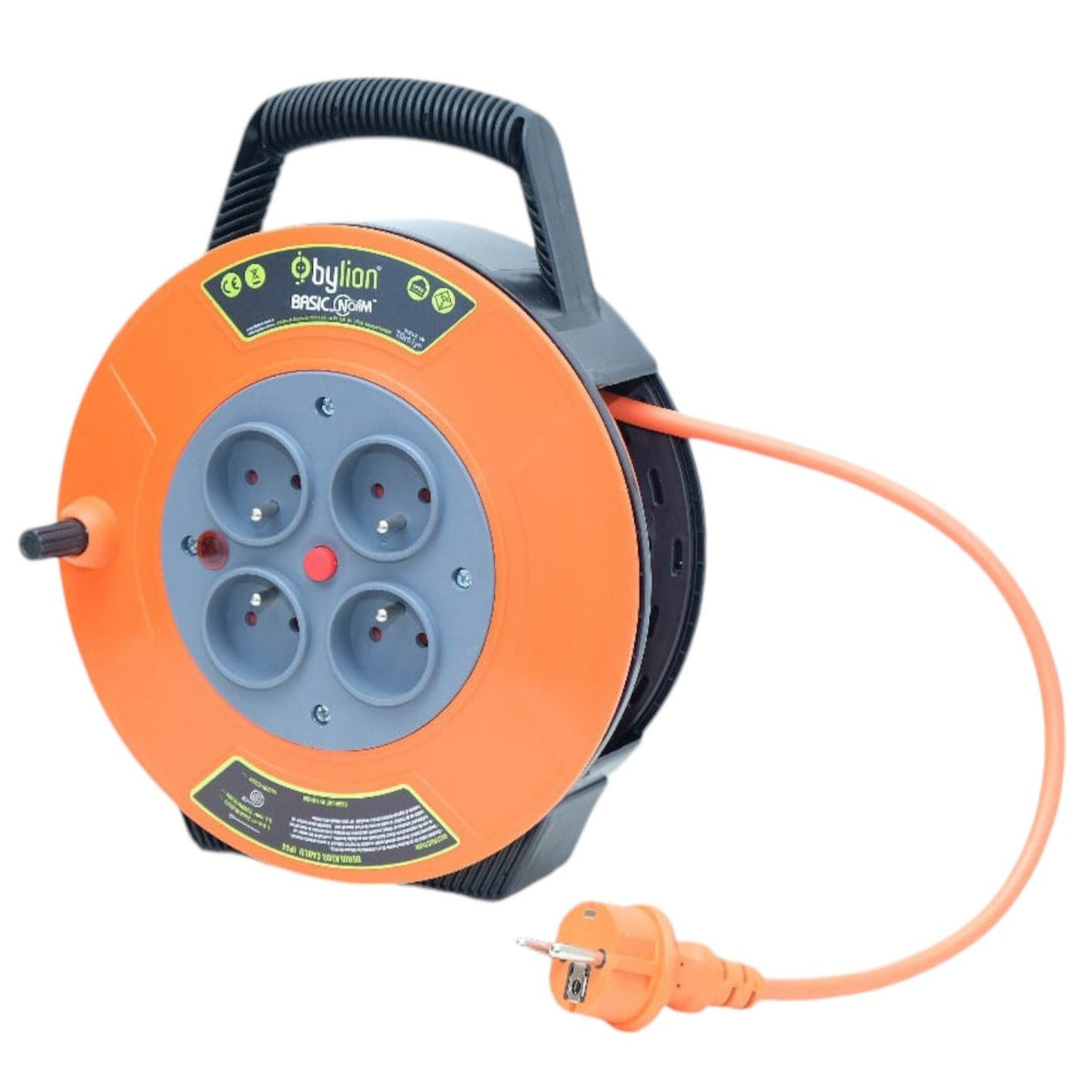 Aufrollbare kompakte Rollspulen-Verlängerungstrommel, 10m 4 Stück Steckdosen mit Griff, Überlastungsschutz, Phasenanzeige, Kindersicherung, 10A 230V Französisch Typ E (Stift), 3x1mm2, , IP20, Mini Basic Norm™, Bylion