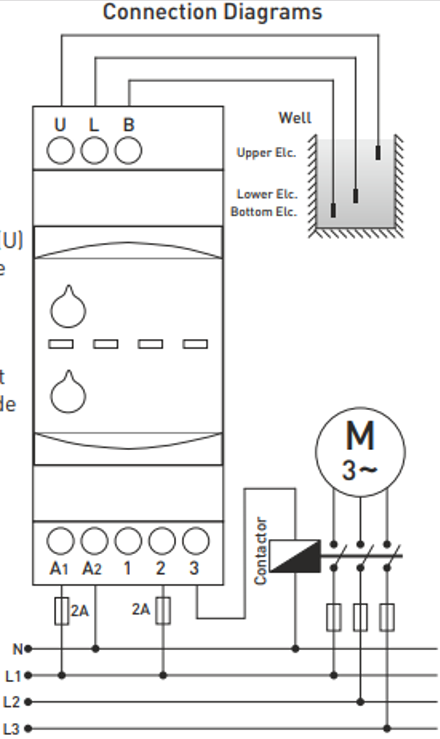 Regulierung des Wasserstandes im Brunnen, Brunnen, Tank, Ausdehnungsgefäß. Drei oder zwei Niveausensoren können zum Abpumpen oder Ablassen von Wasser aus dem Tank verwendet werden. Einstellung der Sensorempfindlichkeit + Einstellung der Ansprechverzögerungszeit. SSR-05D, TENSE