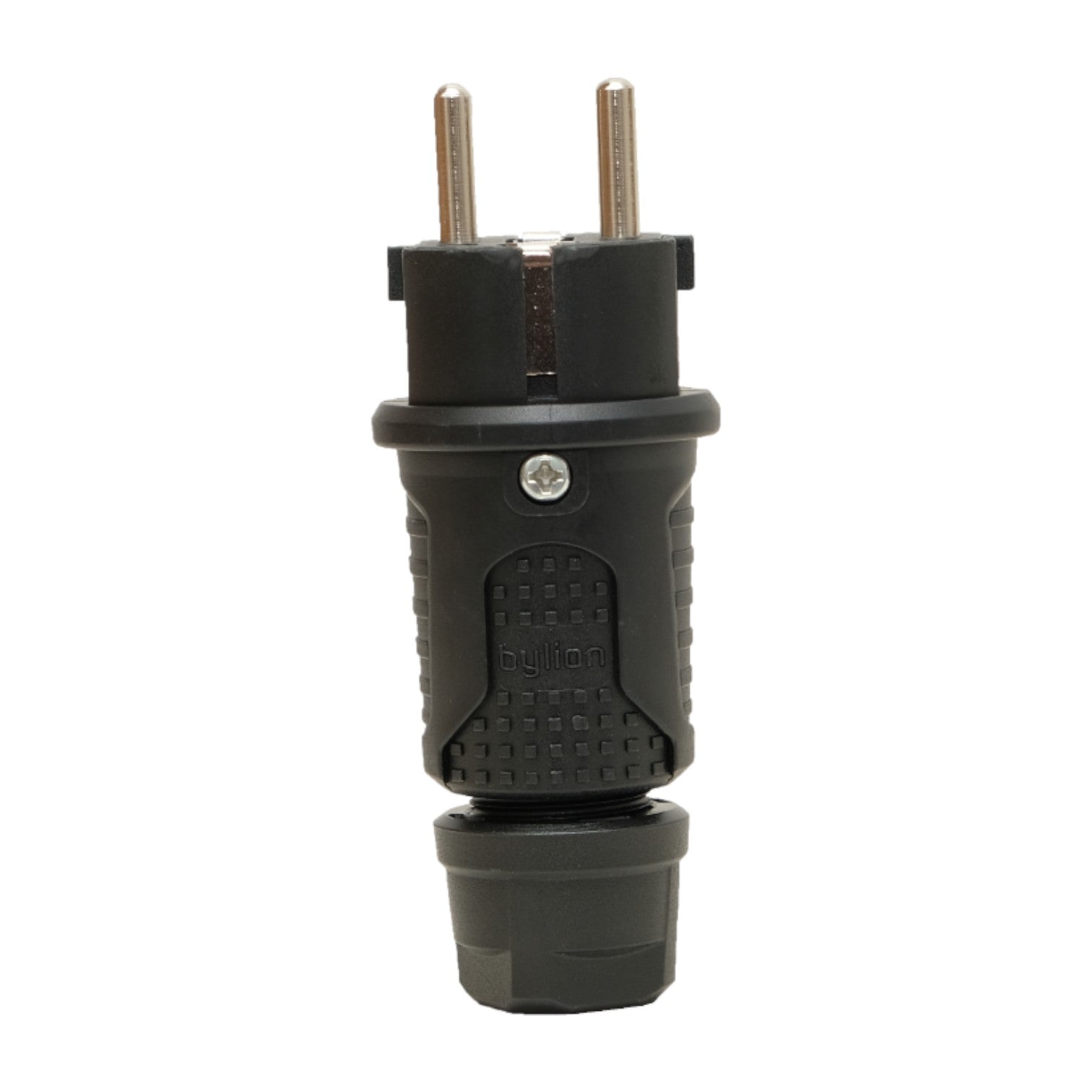 Schwarzer Gummistecker IP54, 250v 16a pro Kabel, Uni-Schuko (Doppelerdung), 2P+E, REF, Bylion