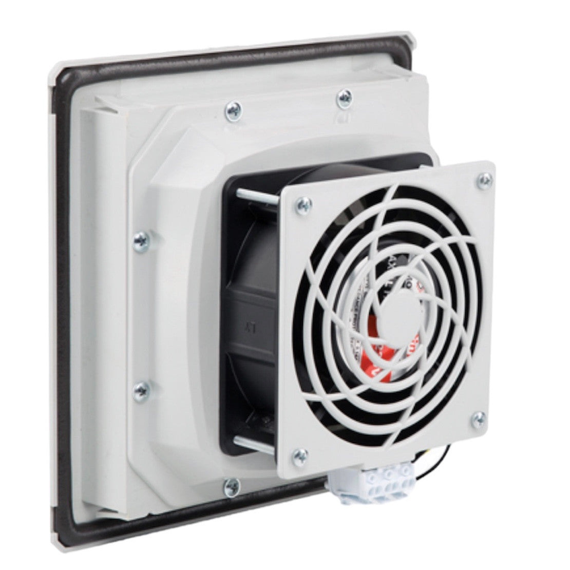 Lüftungsgitter mit Ventilator und Filter, Größe 210x210 mm, für den Einbau in Schalttafeln, Automatisierungsschränken, Geldautomaten oder Spielterminals. PTF2000, Hersteller Plastim (Türkiye)